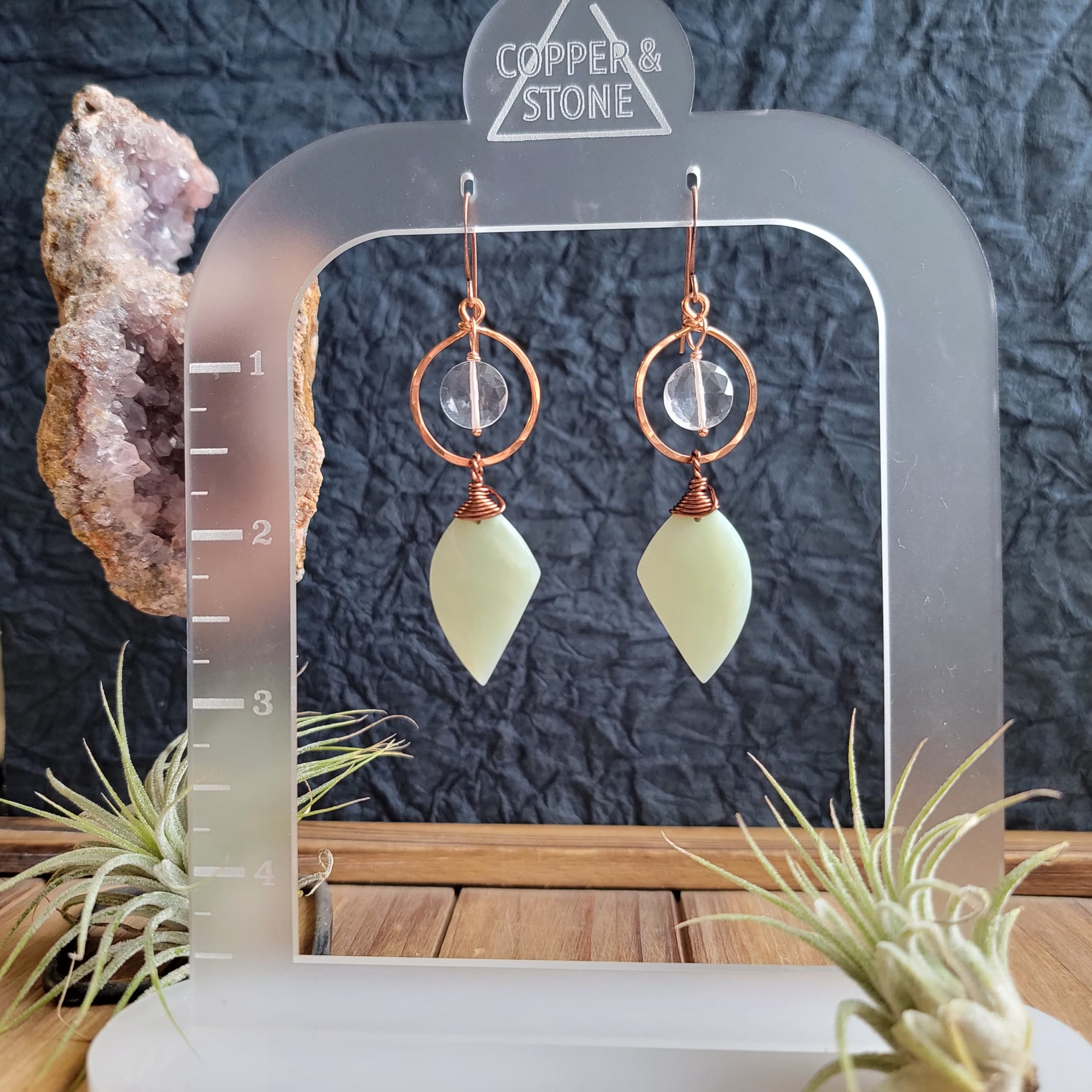 We are loving the Mid-Century vibes that come from pairing these funky shapes together! This pair features pale seafoam green Bowenite stones with faceted Quartz in the hoops.