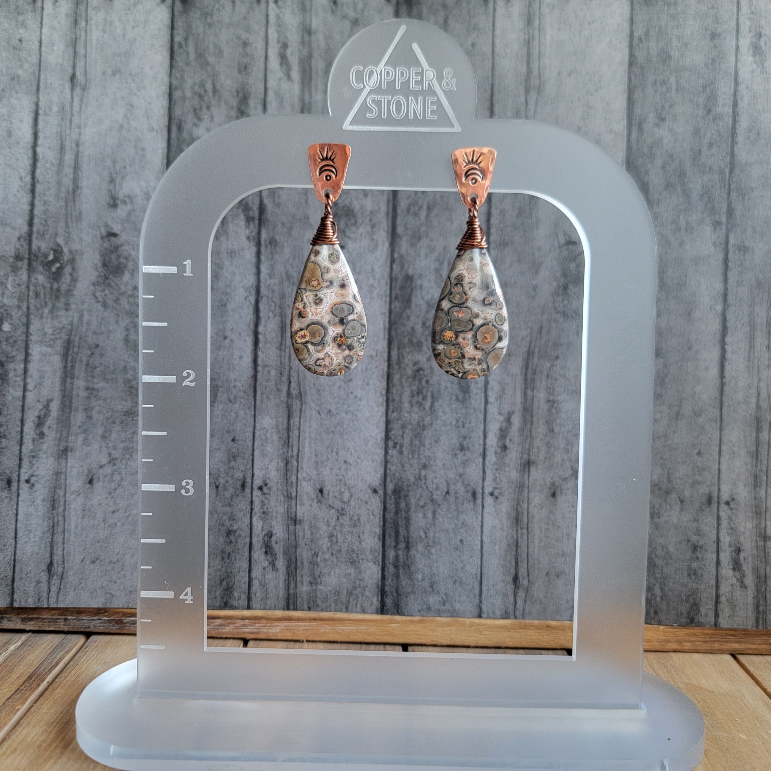 Handmade stamped copper stud top with solid Sterling Siver posts and Leopard Skin Jasper drops.