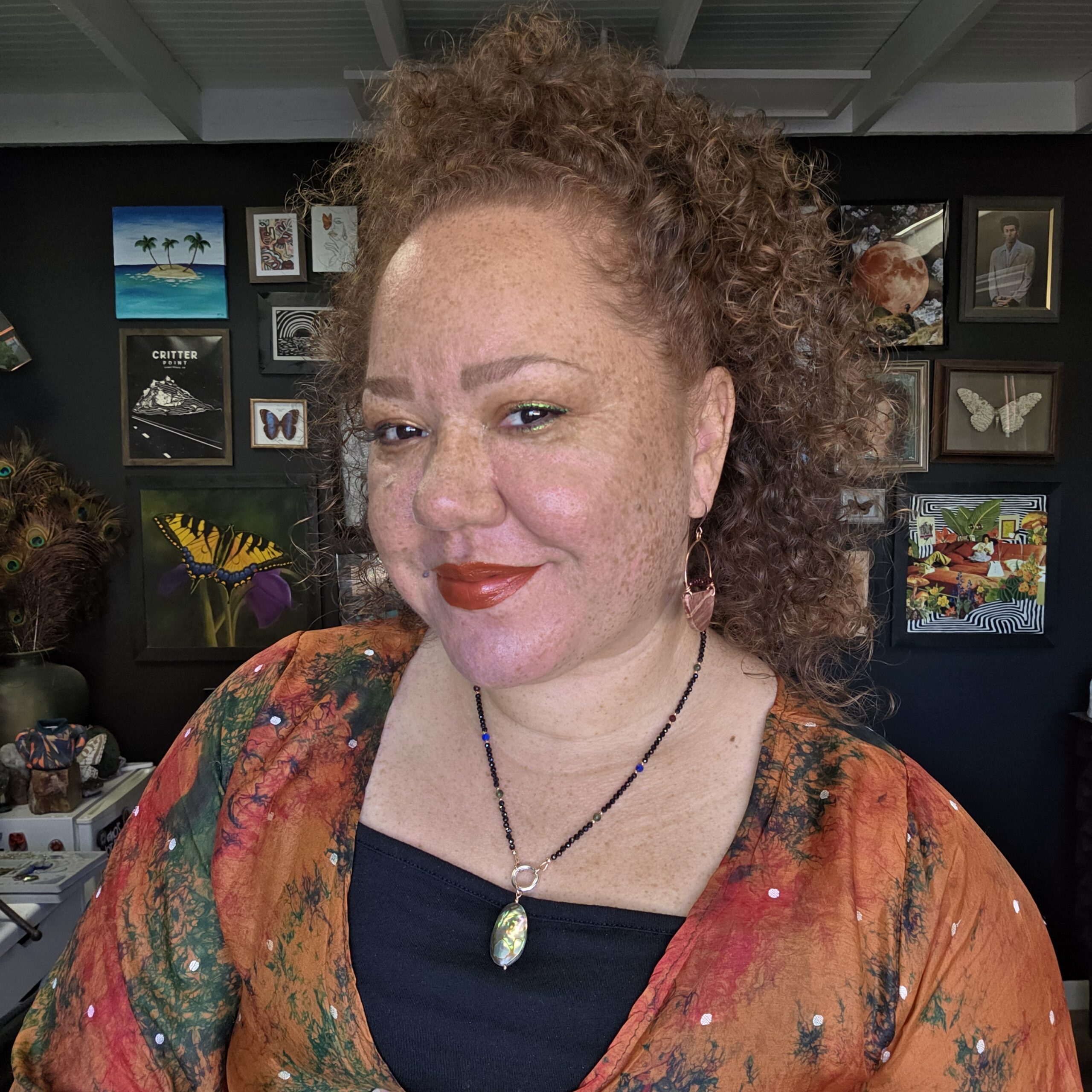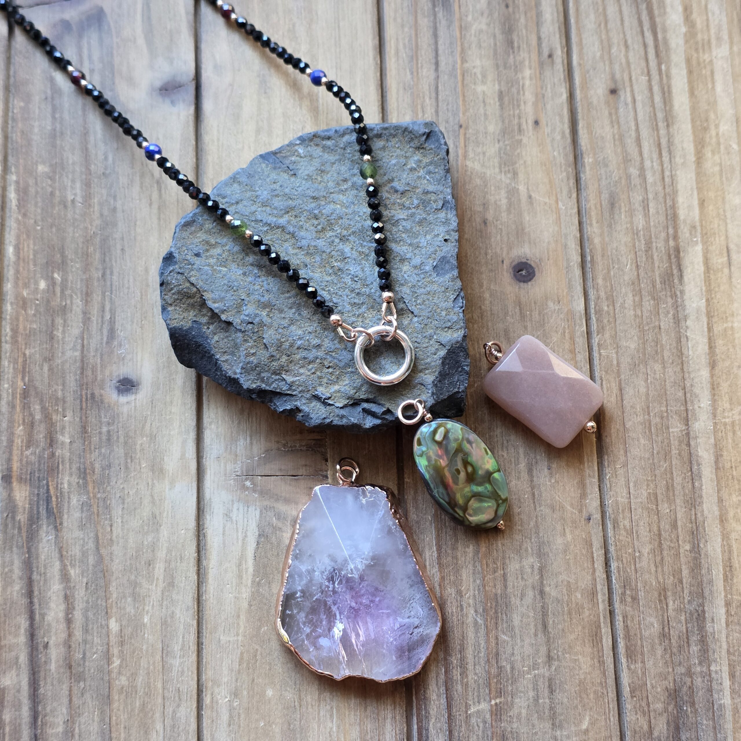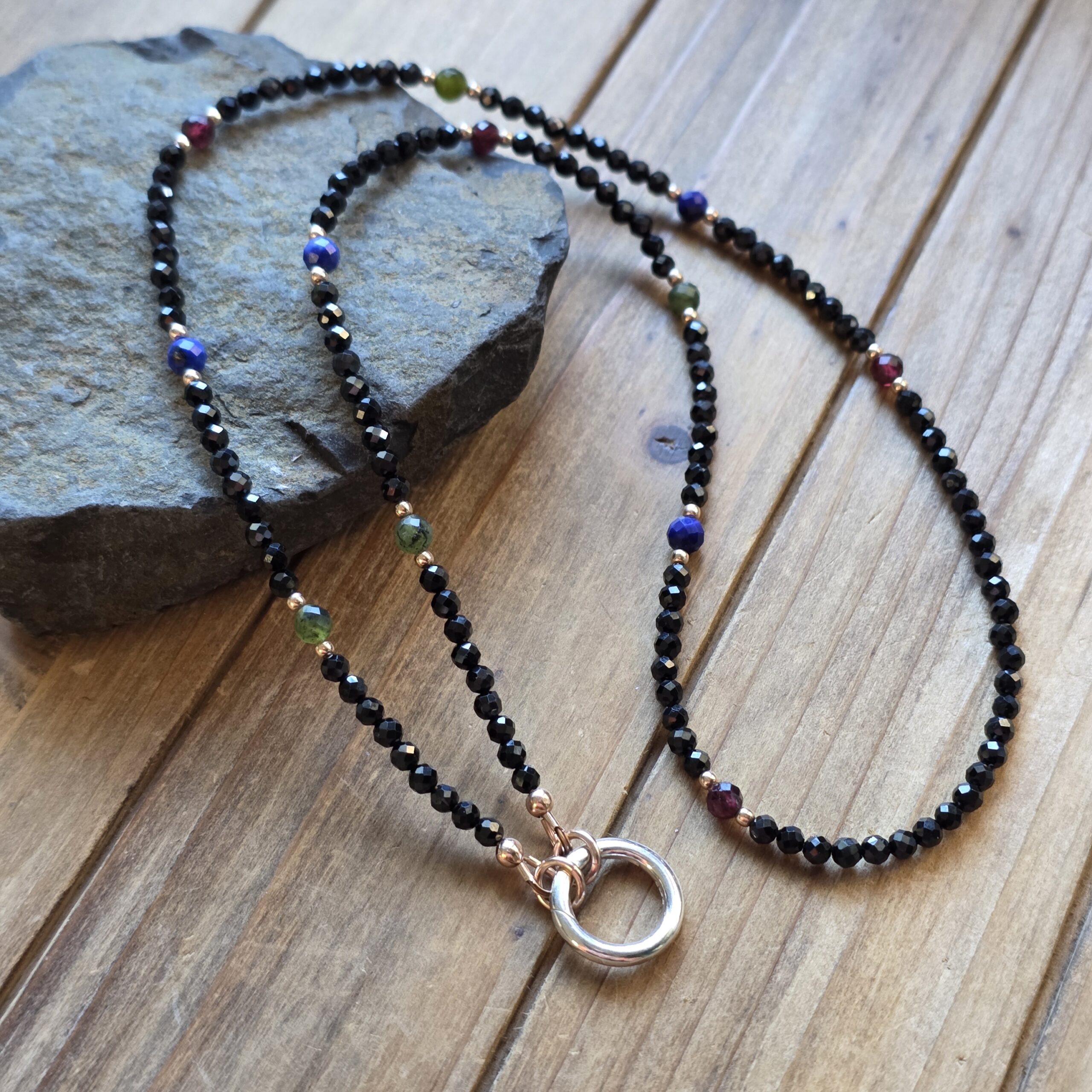 • Beaded charm necklace with Faceted Black Spinel, Canadian Jade, Lapis Lazuli, Garnet