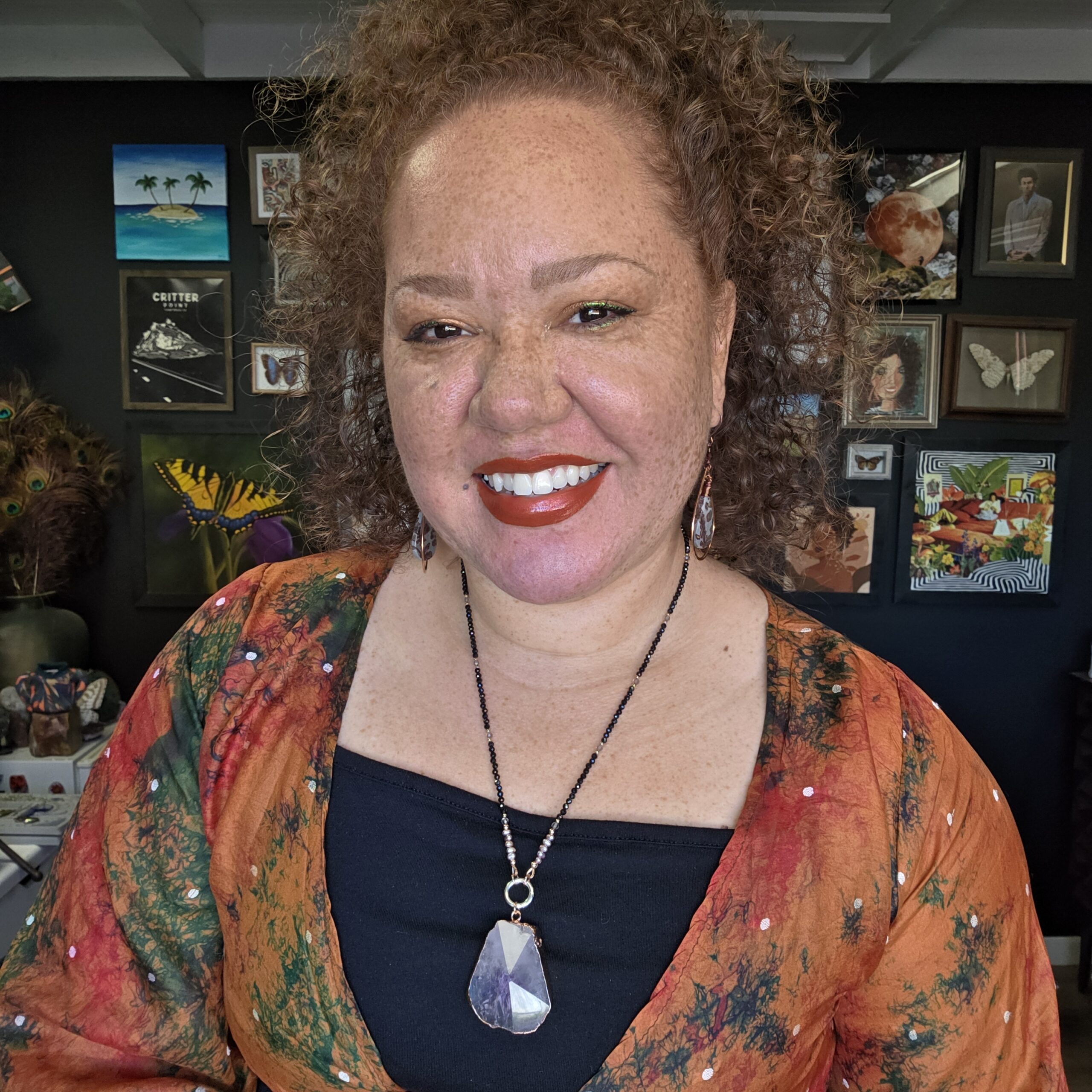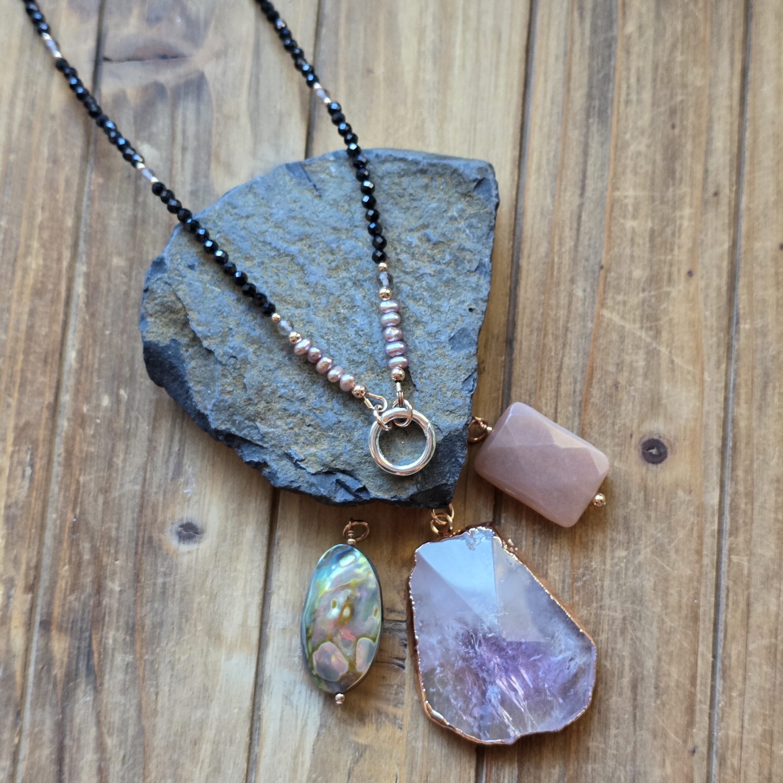 • Beaded charm necklace with Faceted Black Spinel, Freshwater Lavender Pearls, and Ice Obsidian