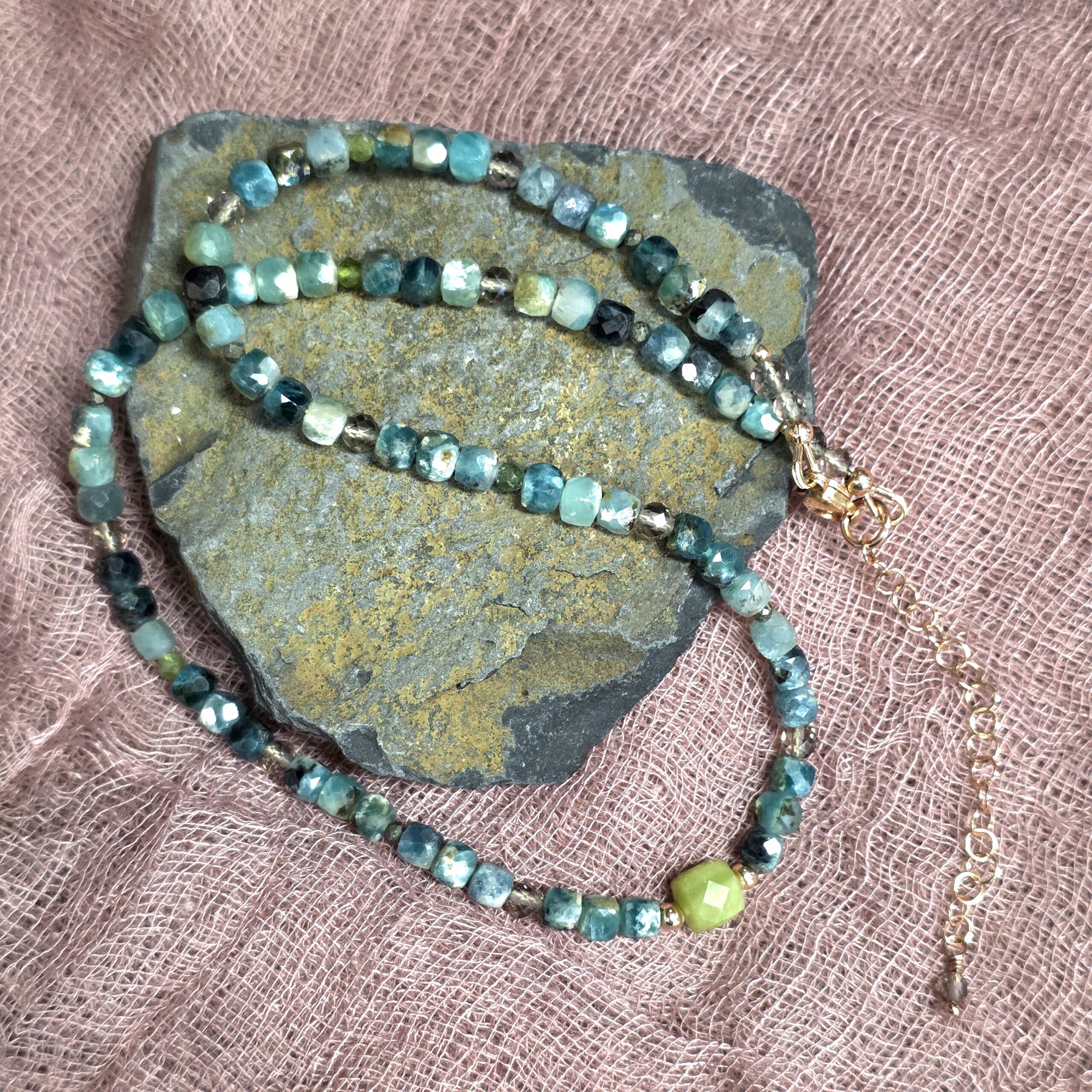 - Beaded necklace with Blue Tourmaline, Ice Obsidian, Canadian Jade, and Pyrite